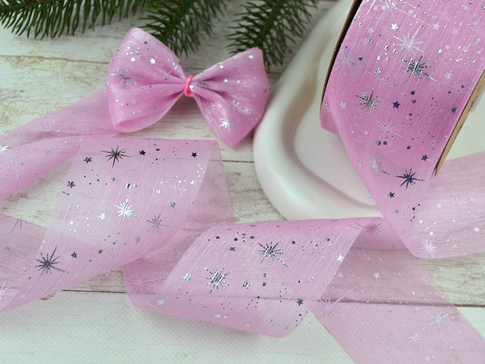 Органза з фактурними складками та срібними сніжинками рожева 60 мм.