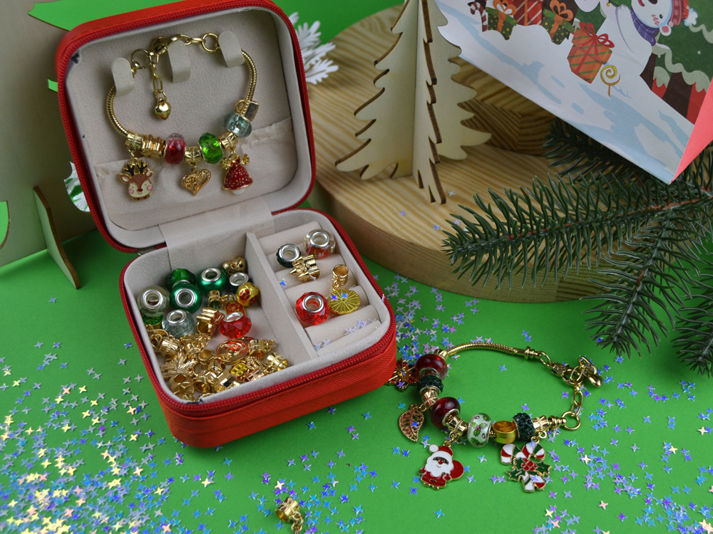 У коробочці зібрано все необхідне, щоб дівчинка створила свої перші прикраси в різдвяному стилі