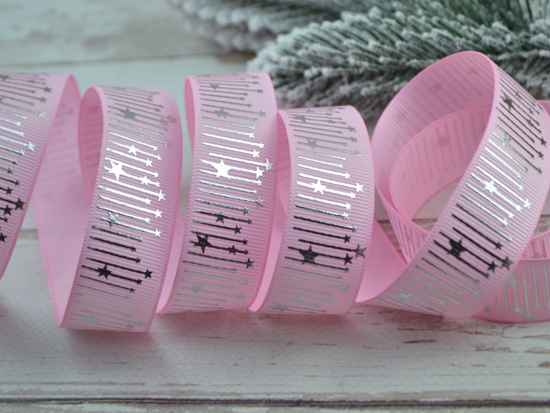 Стрічка репсова Срібний зорепад на рожевому 22 мм.
